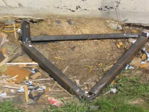 - На следующем шаге в землю вбиваются металлические уголки. Это делается на вершинах прокопанного треугольника. Чтобы облегчить вбивание, при помощи дисковой пилы нужно правильно обрезать металл под острым углом, образовав своеобразное копье. Как уже отмечалось, уголки должны быть длиной 2 метра. Вбивать их нужно полностью, оставив лишь около 5 см над поверхностью грунта.