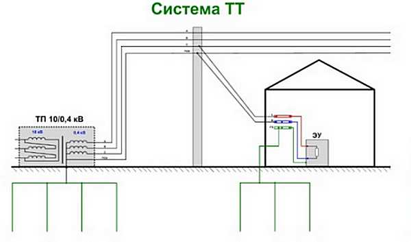 Система TT предполагает «глухое» заземление нейтрали источника, и передачу трехфазного напряжения по четырем проводам.