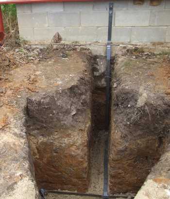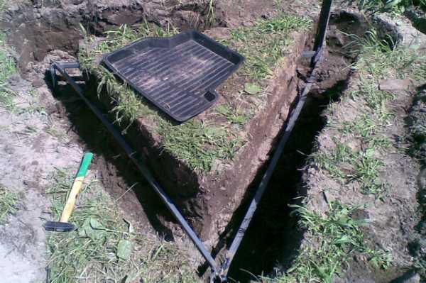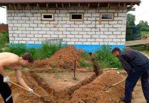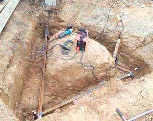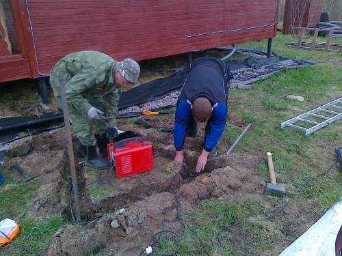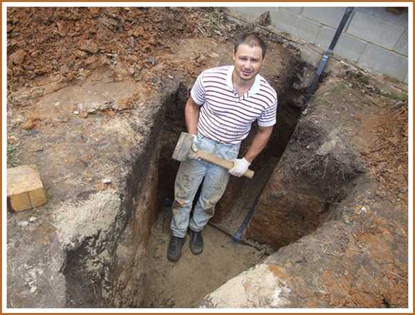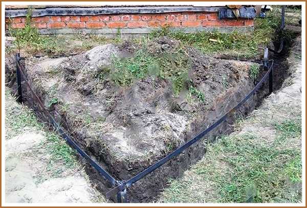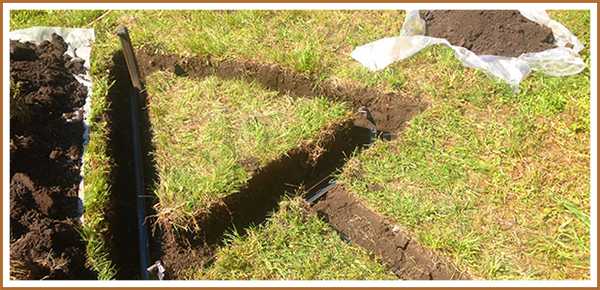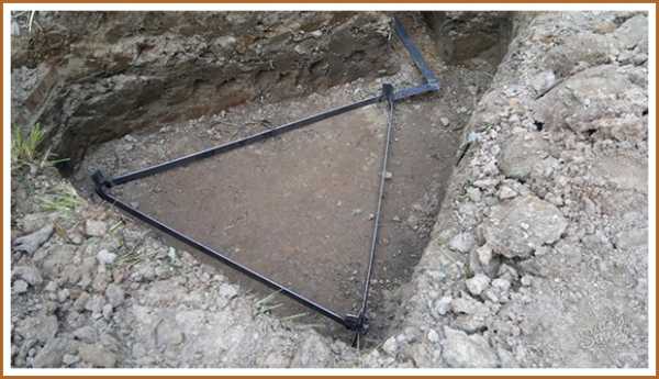 - Земляные работы. На этом этапе нужно прокопать траншею глубиной 50 см по направлению от стены дома к выбранному месту установки контура. Также нужно выкопать траншею такой же глубины в форме треугольника. При этом каждая сторона замкнутого треугольника должна составлять не менее 120 см.