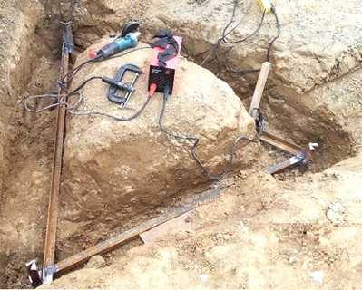 - Затем в траншею, прокопанную в сторону стены дома, укладывается еще одна металлическая полоса, при этом она приваривается к ближайшему вбитому в землю уголку. Возле фундамента полоса загибается на 90° и выводится выше уровня грунта на 50 см.