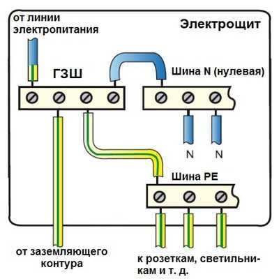 Нулевая шина должна быть изолирована от корпуса щита, а заземляющая – закреплена непосредственно к корпусу с обеспечением электрического контакта. Нулевая и заземляющая жилы подключаются к соответствующей шине. При этом соединение шин между собой категорически запрещается. Подводка к каждому потребителю, требующему заземления, должна выполняться трехжильным кабелем. Заземляющая жила должна присоединяться к предназначенному для этого контакту. Все розетки в доме должны быть с заземлением (евророзетки).