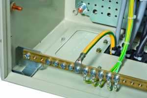 Теперь можно осуществить соединение щитка с заземлительным контуром. Это проделывается при помощи многожильного провода из меди. При этом один конец соединяется со щитком, а другой, соответственно, крепится к проводнику заземляющему.