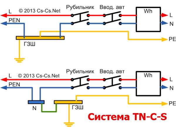 - TN-C-S. Аналогична подсистеме TN-C, но на вводе в дом производится расщепление общего проводника на нулевой рабочий и отдельно нулевой защитный. При этом требуется произвести дополнительно повторное заземление жилого дома. Рекомендуется взамен TN-C.