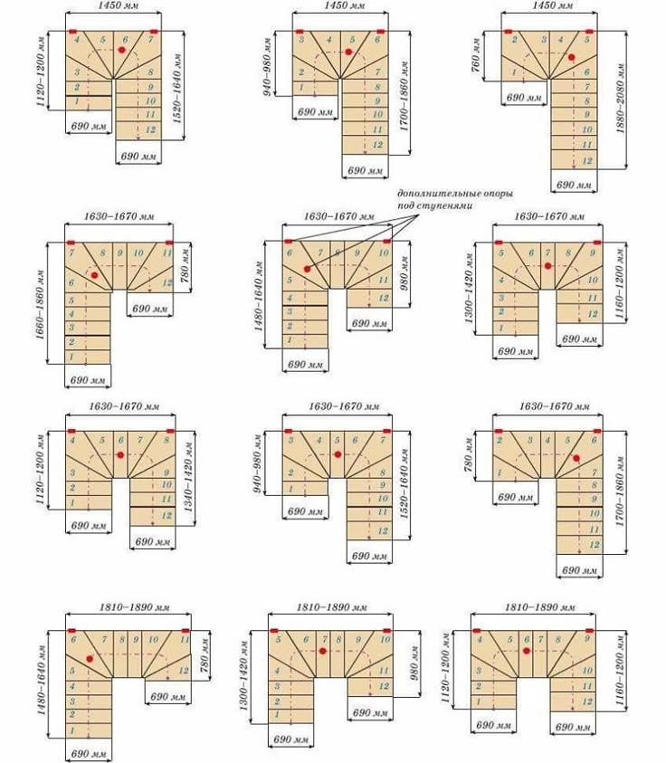 Их изготавливают с одного края в 2 раза меньше чем с другого, с переходом, выполненным плавно по длине. Расчеты не должны предусматривать марш с «гусиным шагом» уже чем 0,9 м, т. к. это может привести к разрушению материалов, из которых изготавливается ступень.