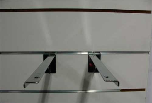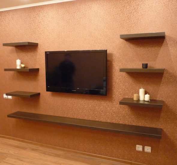 Настенные полки на кронштейнах, которые крепится к стене. Сверху к кронштейнам монтируется сама полка.