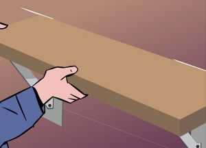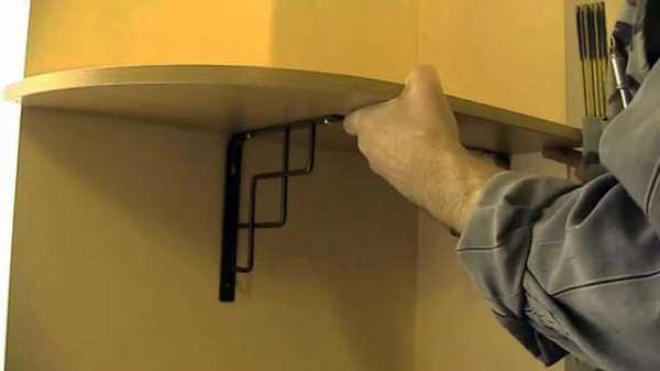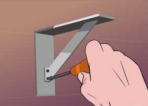 - Прикладываем доску к кронштейнам и прикручиваем ее снизу к отверстиям в них. Шурупы нужно выбирать такого размера, чтобы они не вышли через полку насквозь.