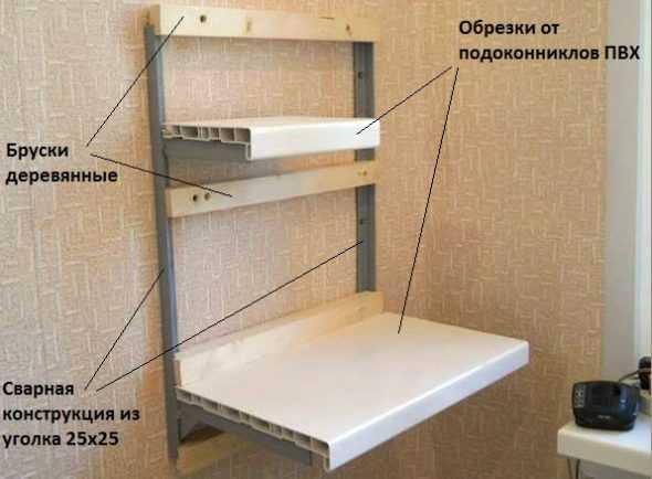 Чтобы полка была ровной, и впоследствии ее не перекосило, в нижней части, с обратной стороны, можно зафиксировать расположение деталей плоскими оконными уголками.