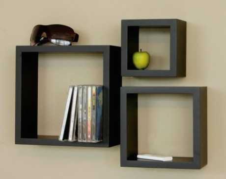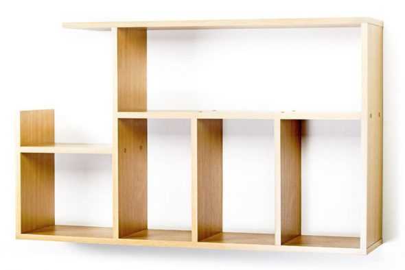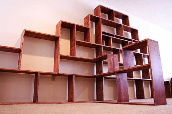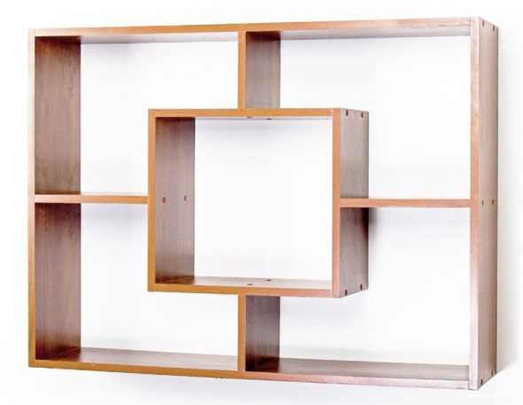 Проще всего собрать настенные полки, состоящие из боковых, верхней и нижней стенок, скрепленных между собой саморезами или мебельной фурнитурой. Сделайте таких «модулей» разной длины и высоты необходимое количество и закрепите их на стене в нужном порядке. Такой вариант хорошо подходит для изготовления книжных полок.