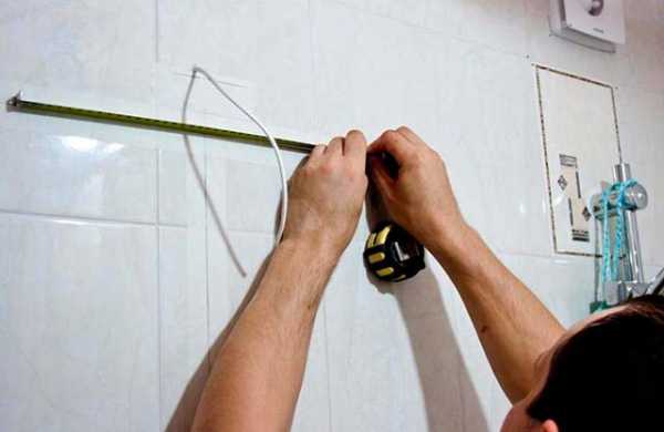 - Прислоняем выбранный нами кронштейн к стене, делаем отметки в тех местах, где планируем повесить полку. Линейку прикладываем к отметкам и делаем отметки там, где будет расположено второе крепление.