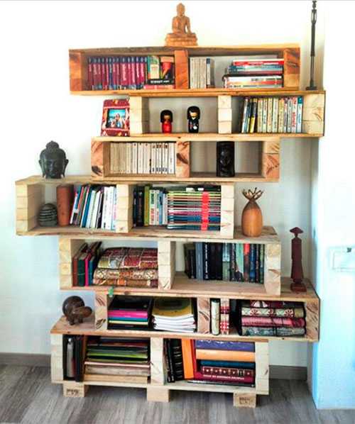 Полка изогнутой формы из деревянных брусков, как будто прогнулась под тяжестью книг.