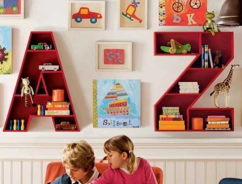 Отличное решение настенных полок для детской. Конструкции выполнены в виде букв. Яркие цветовые акценты не только создают настроение, но и способствуют развитию ребенка.