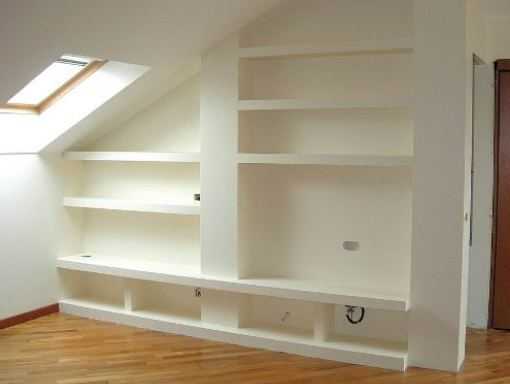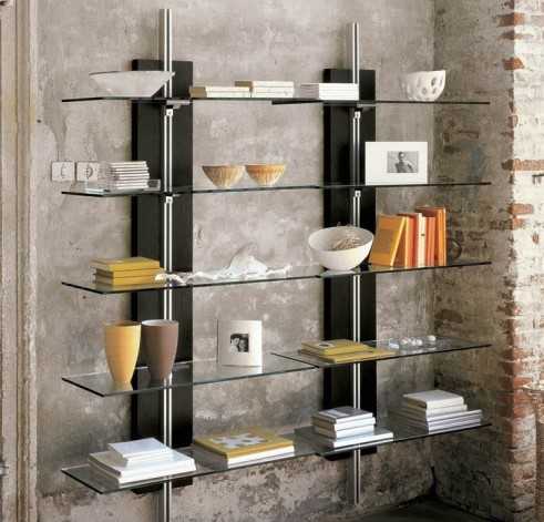 Вешают полки на стену, ставят на пол, некоторые подвешивают к потолку или балкам.