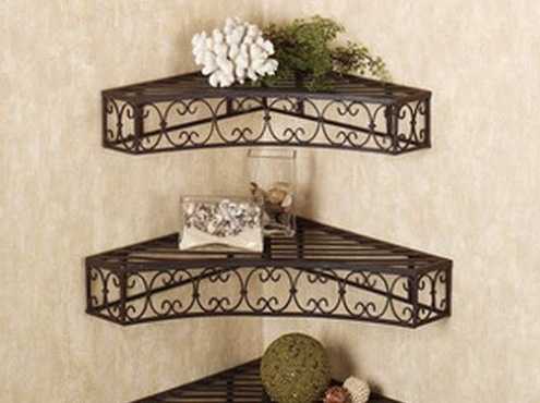Обыграть углы помещений можно угловыми полками. Кострукция отлично впишется как во внутренний угол двух смежных стен, так и на стыке стен снаружи. Ажурная металлическая угловая полка – украшение интерьера.
