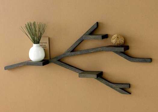 Необычная декоративная полка в виде ветки дерева на фоне монохромной стены.