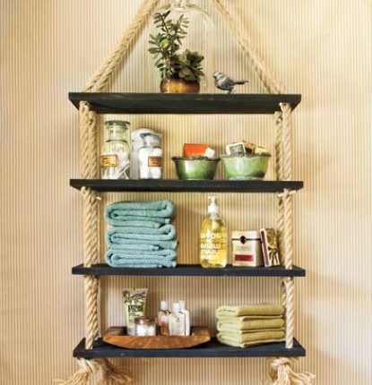Бюджетный вариант подвесной конструкции сочетает в себе деревянные полочки, нанизанные на канаты. Полка может крепиться как к потолку, так и к стене на кронштейне.