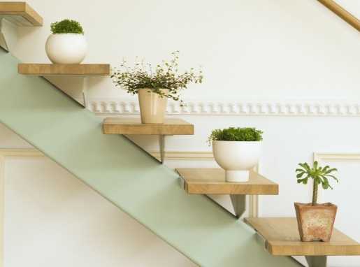 Оригинальная комбинированная настенная полка из металла и дерева для цветов в виде лестницы украсит любое помещение.