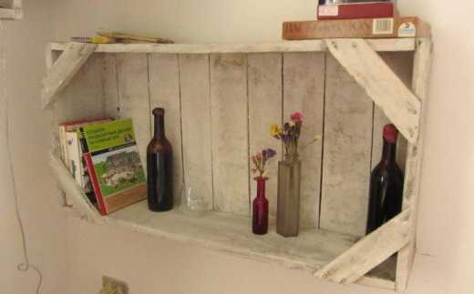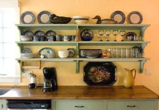 Деревянная настенная полка из ящика уместна в интерьере кухни в стиле кантри.