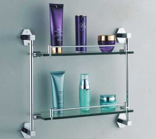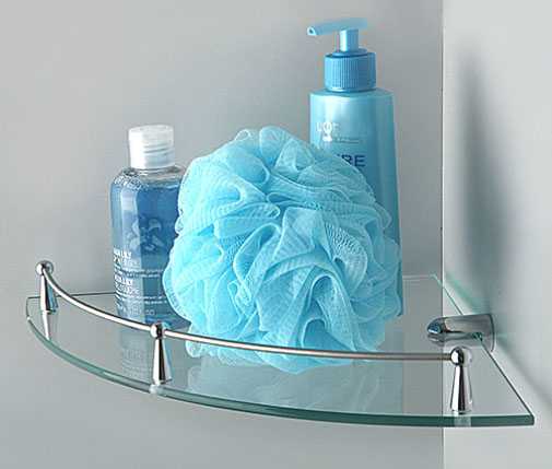 Угловая стеклянная полка для ванной комнаты крепится с помощью специального кронштейна, состоящего из двух частей: основания и подвижной консоли. Стекло зажимается между частями кронштейна при закручивании винта, находящегося в нижней части крепления. Предварительно кронштейн крепится к стене, а уже затем нанизывается стеклянная полка.