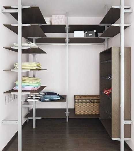 Обустройство гардеробной конструкцией полок на кронштейнах и металлических стойках. Стойки фиксируются к стенам, полу и потолку.
