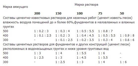 Пропорции компонентов цементно-известково-песчаного штукатурного раствора для цемента марки М400: