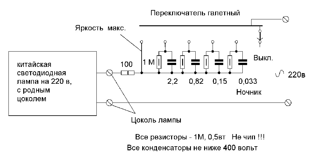 Все электронные компоненты нужно установить на плате по схеме диммера: при поступлении тока с резисторного элемента на конденсатор будет происходить зарядка и подаваться напряжение на лампу. Компоненты нужно соединить между собой при помощи пайки. На плате нужно сделать отверстия, которые будут служить в качестве выводов. После сборки нужно провести тестирование собранного диммера.