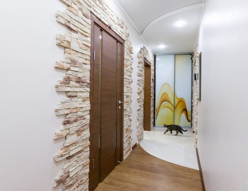 Не обязательно полностью облицовывать стены декоративным камнем, если только вы не хотите иметь мебель, напоминающую средневековье. Достаточно нанести легкие, слегка небрежные мазки, которые выделят и подчеркнут нюансы интерьера: зону вокруг зеркал, дверные проемы, полости, ниши, светильники, картины. Как вариант — частичная отделка камнем стен коридора.
