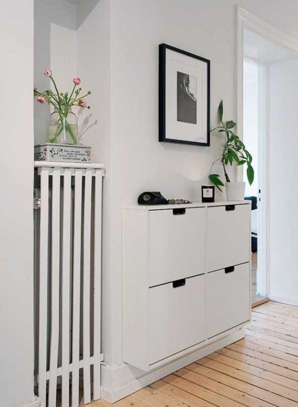 Полки для обуви в прихожуюКомпактное применение этих составляющих позволит в любой угол вместить небольшой стеллаж с несколькими крючками, внизу которого будет сидение. Еще ниже расположатся полки для обуви. Если пространство позволяет, то лучше сделать встроенную мебель – шкаф-купе. Для этого нужно предварительно обдумать количество полок, выдвижных ящиков и места для вешалок. Обычно для маленьких прихожих применяются шкафы шириной 40 см, которые довольно компактны.