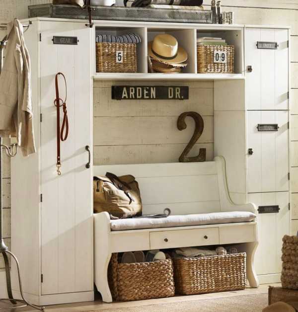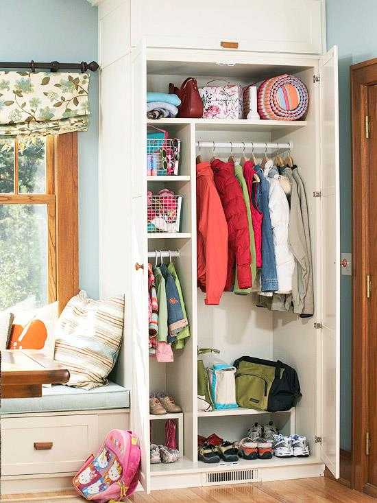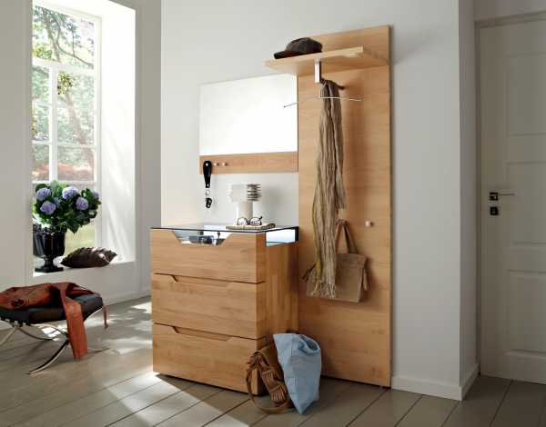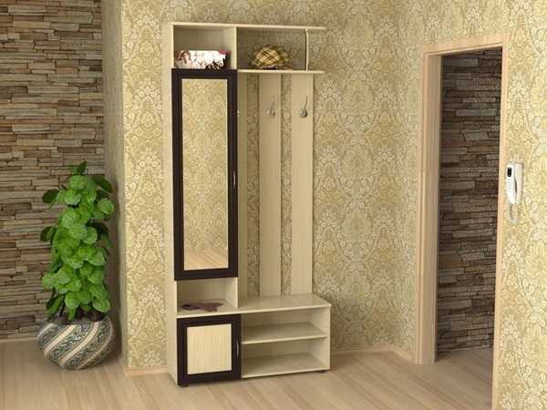 Компактное применение этих составляющих позволит в любой угол вместить небольшой стеллаж с несколькими крючками, внизу которого будет сидение. Еще ниже расположатся полки для обуви. Если пространство позволяет, то лучше сделать встроенную мебель – шкаф-купе. Для этого нужно предварительно обдумать количество полок, выдвижных ящиков и места для вешалок. Обычно для маленьких прихожих применяются шкафы шириной 40 см, которые довольно компактны.