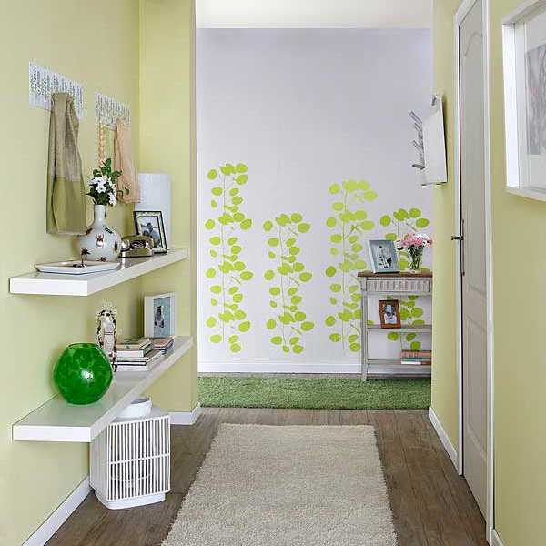 На сегодняшний день существует большой ассортимент настенных покрытий – это и обычные обои, под покраску и жидкие, декоративная штукатурка и различные виды краски. В отличие от пола, стены не должны быть темными, светлые и постельные тона выглядят уютнее, к тому же визуально увеличивают пространство, особенно если у вас происходит ремонт узкой прихожей. Сейчас есть много актуальных идей по декорированию стен, к примеру, кирпичом, деревом, натуральным мхом или специальными наклейками.