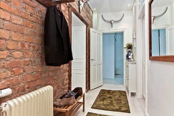 Отделка стен декоративным кирпичомПри выборе обоев в маленькой квартире следует обратить внимание на качество. Обычные бумажные быстро сотрутся или испачкаются. Дешевый вариант не подходит однозначно. Необходимо приобрести моющиеся варианты, которые достаточно прочны и долговечны. Как вариант, может быть покрытие стен виниловыми обоями на фото. Чтоб придать изюминку интерьеру, можно использовать вставки из какого-либо материала: деревянного сайдинга, камня, декоративной штукатурки при выполнении ремонта прихожей. Дизайн стен значительно преобразит комнату, если дополнительным декором выполнить отделку, например, вокруг двери или зеркала.