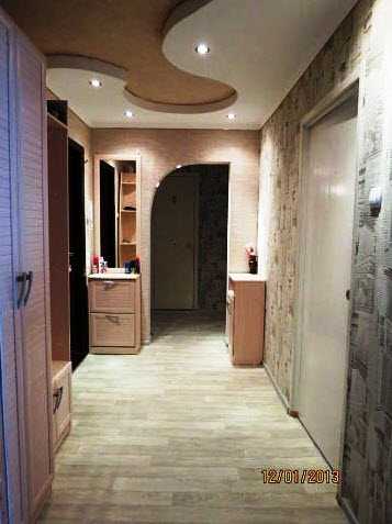 Весьма примечательный вариант ремонта небольшой прихожей, выполненный в несколько поднадоевшем уже, но все еще актуальном бежево-коричневом цвете. Особой художественной подготовки не нужно чтобы отметить удачное сочетание мебельного гарнитура, форм-фактора двери, тона напольной плитки и глянцевых натяжных потолков.Это не интерьер мечты, о нет, но смотрится для хрущевки более чем прилично!