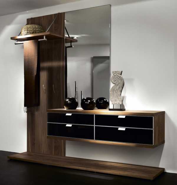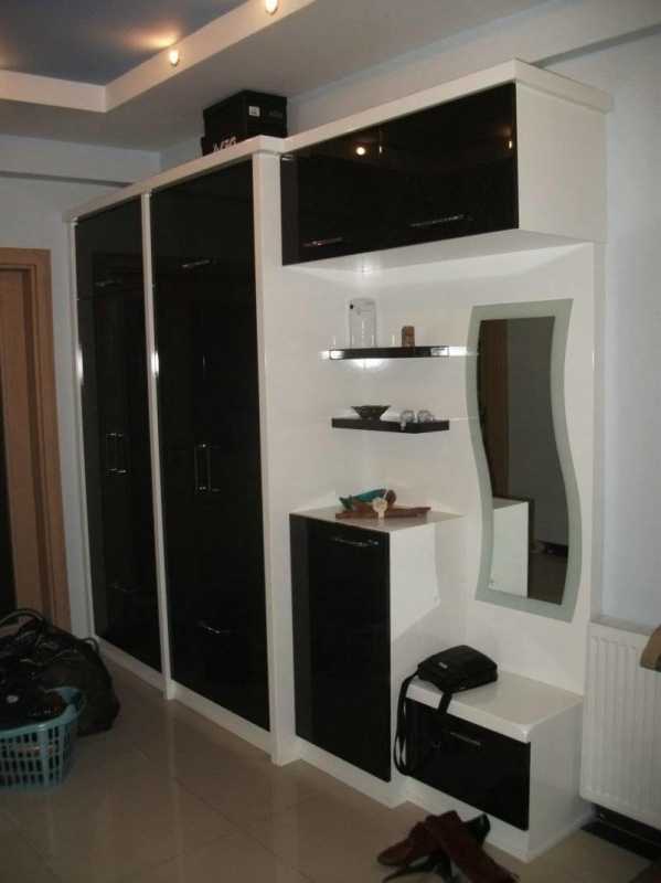 Если в вашей прихожей присутствует мебель вот такого плана, то обязательно акцентируйте на ней внимание при помощи грамотно реализованного освещения.Конкретно такой вариант черно-белого шкафа примечателен продуманностью конструкции и хорошей сочетаемостью с малогабаритными жилыми помещениями.