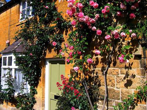 - Если высаживаются вьющиеся сорта роз, то их можно расположить таким образом, чтобы они цеплялись за фасад здания. Это, несомненно, украсит вход. Можно также посадить эти сорта цветов рядом с деревянными беседками.