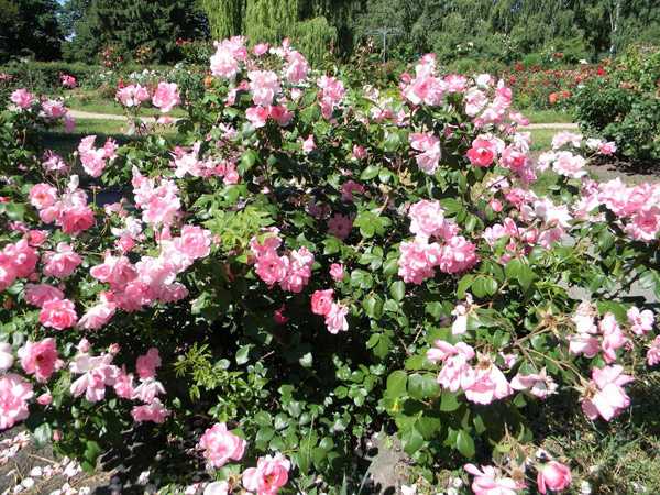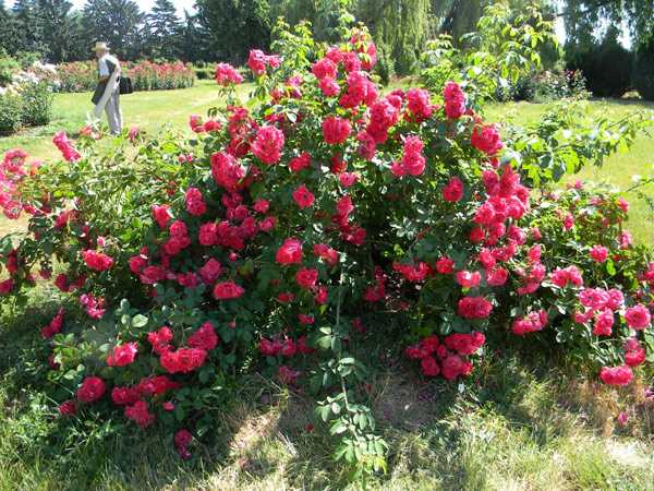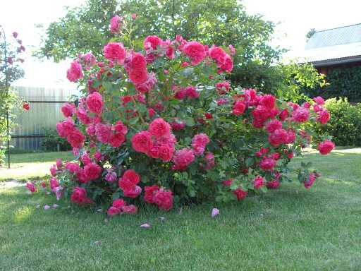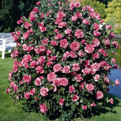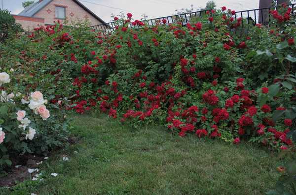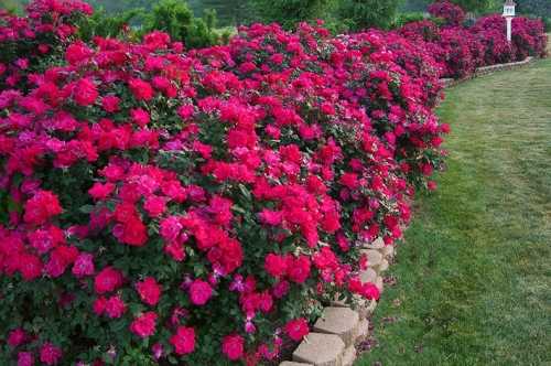 - Обильно цветущие розы отлично смотрятся в виде группы на газонах, у водоема, или в качестве живой изгороди, которая распростерлась по периметру сада.