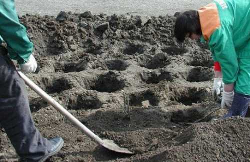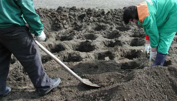 - Выкопать ямки глубиной 50-60 см. Если уровень грунтовых вод менее 1,5 метра, то сначала выполнить дренаж: вырыть котлован глубиной 70 см, засыпать керамзит, строительный мусор или гравий, утрамбовать, добавить чернозем, песок и торф.