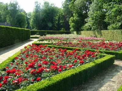 - Регулярный в виде прямоугольных, овальных, квадратных клумб с красивой окантовкой из кирпичной, мраморной крошки, мелкого щебня или гальки подойдет для большого пространства. Главное условие реализации стиля – соблюдение правильных геометрических форм цветника. Изысканным оформлением розария могут быть травяные газоны, садовые дорожки, декоративное ограждение.