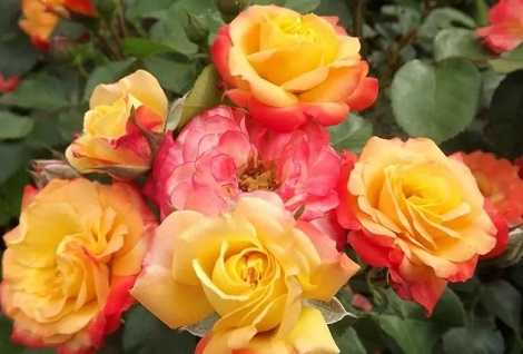 - Розы Флорибунда известны как «обильно-цветущие». Они достигают 1,3 м. На побегах цветки располагаются соцветиями, их количество иногда достигает десяти штук. Пользуются большой популярностью благодаря продолжительному цветению, множеству цветов и богатому аромату.