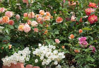 Опытные садоводы предпочитают составлять розарий из растений разнообразных сортов, которые не только цветут в разное время, но еще отличаются размерами и окраской, высотой. Особенно удачно сочетаются контрастные цвета: белый и красный, желтый и красный, кремовый и красный, розовый и белый. В подобном розарии можно высадить по несколько кустов каждого сорта.