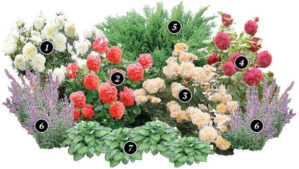 1. Роза Winchester Cathedral, 2. Роза Lady Emma Hamilton,3. Роза Molineux, 4. Роза William Shakespeare, 5. Можжевельник, 6. Шалфей или котовник Фассена, 7. Хосты.