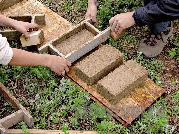 Совет: Для приготовления небольших порций самана смесь глины с песком замешивают в корыте на воде, можно лопатой, проверяя вязкость – готовая масса похожа на густую сметану, которая стекает с лопаты. Далее растительный наполнитель перемешивают с вязкой глиной и скидывают в формы лопатой и утрамбовывают руками, особенно по углам, а верх выравнивают.