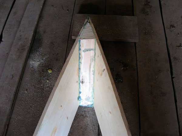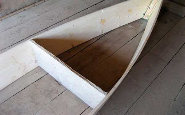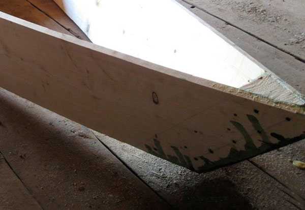После этого приступаем к изготовлению основы носа — треугольного бруска. Его длина должна превышать примерно в 1,5 раза ширину бортов лодки. Брусок также строгаем и покрываем защитным слоем.