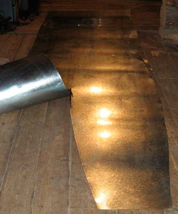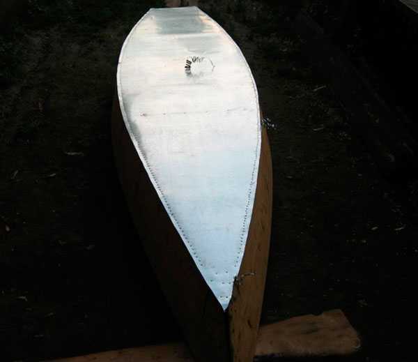 После того как пропитка и столярный клей высохнут можно приступать к изготовлению ее дна. Для этого нам понадобится гладкий оцинкованный лист. Желательно, чтобы его длина соответствовала длине судна. Правда подобрать такой не просто, дело в том, что строительные магазины торгуют в основном небольшими листами (1,2х2м, 1.5х2), а от больших рулонов они отрезают очень не охотно. Если договориться не удастся, берите то, что есть. Дно можно сделать и из двух листов, просто получиться чуть по сложнее.