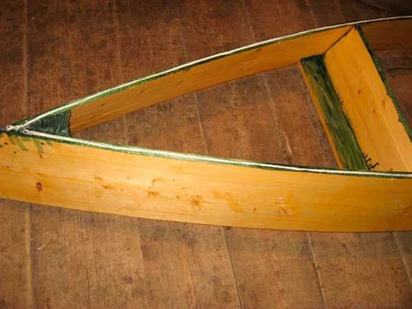 Далее их нужно прострогать, а с запиленных концов снять фаску таким образом, чтобы прижатые друг к другу доски в носовой части не имели зазора.Эти участки, а в дальнейшем и все остальные, которые будут недоступны к покраске после сборки конструкции, пропитываем защитным слоем антисептика.