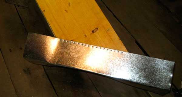Те места, в которых жесть выступает за края более чем на 5мм, обрезаем. Оставшееся простукиваем молотком, загибая на борт.