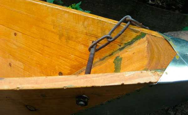 Новая лодка на водоеме обязательно привлечет к себе внимание, чтобы как то обезопасить ее от посягательств или чтобы ее не унесло течением, делаем крепление для цепи в носовой части. Для это нам понадобиться длинный болт или шпилька. Сверлим отверстие в бортах ровно по диаметру шпильки, закрепив ее, отпиливаем лишне ножовкой по металлу.