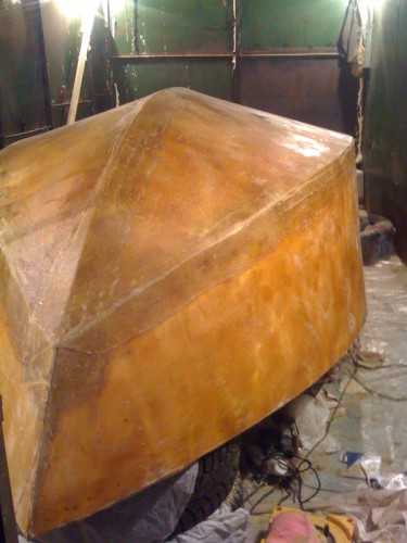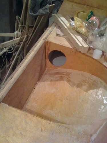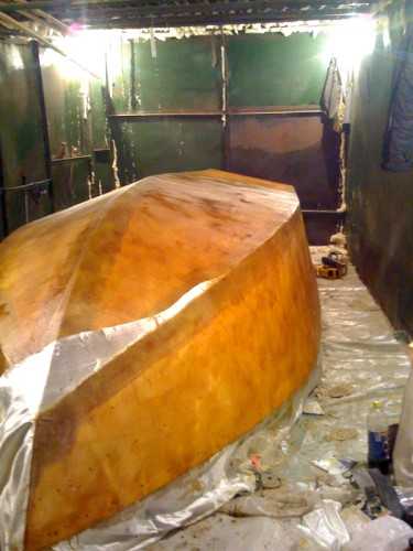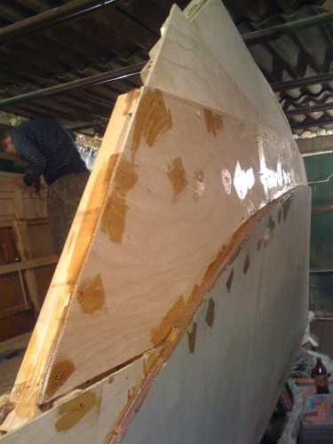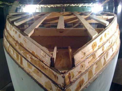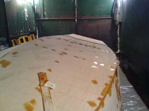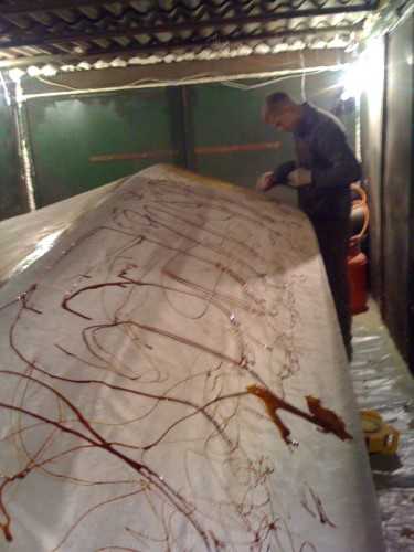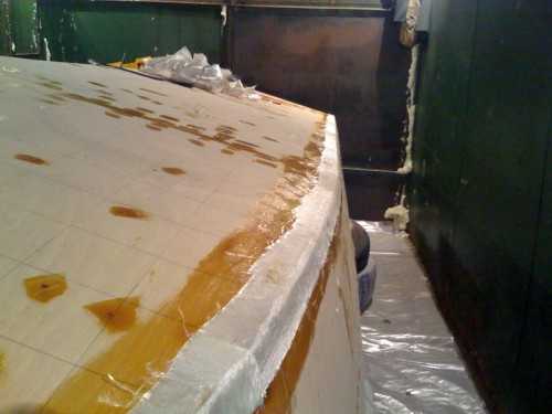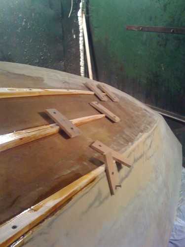 Проклейка лент стеклоткани осуществляется на зоны внутренних швов, с использованием приготовленной ранее смеси. Их же используют и при фиксации шпангоутов.
