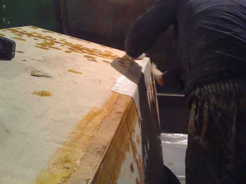 Для проведения клеевых работ вам понадобится приготовить смесь, состоящую из эпоксидной смолы и аэросила, смешанных в равных пропорциях. Угловые зоны днища, транца и бортов следует усилить при помощи деревянных галтель или же уголков.