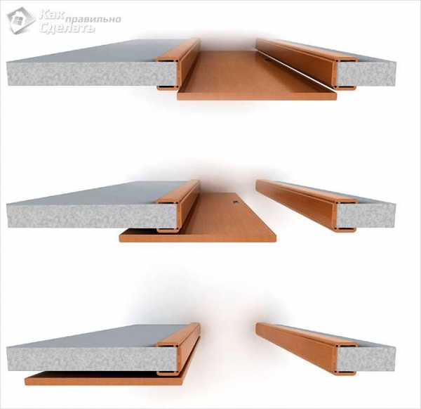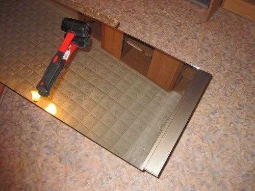 - Отрезав лист по размеру, удалите все сколы по краям. ДСП по периметру окантовываете алюминиевым профилем. Это сделает дверное полотно достаточно жестким и прочным. Как вариант профиль можно приклеить к полотну или в торец закрутить саморезы.