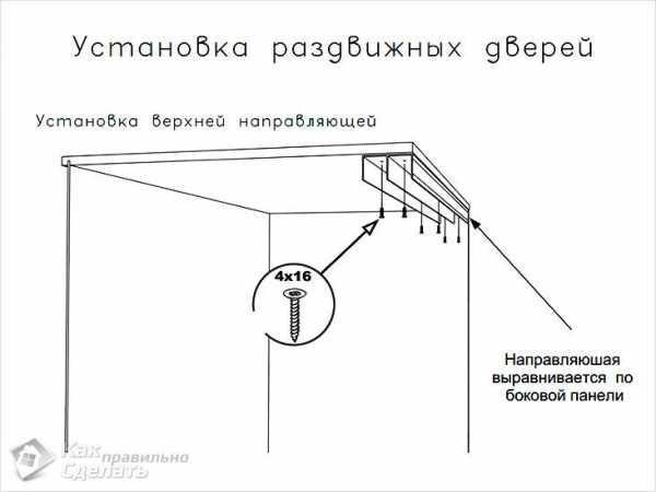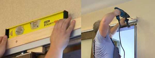 Прежде всего, следует установить верхнюю направляющую, которая, в свою очередь, будет крепиться либо к специальному бруску, либо непосредственно к потолку посредством шуруповерта и разного рода креплений.