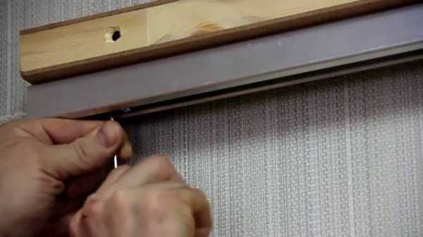 3. К нижнему торцу полотна надо прикрепить направляющую. Одновременно надо вставить ролики в верхнюю. С помощью планки на верхнем срезе полотна следует совместить его с роликами, четко промеряя горизонтальное положение уровнем.